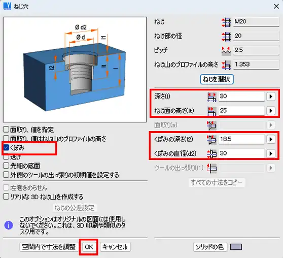 </li - 「ねじ穴」ウィンドウに戻り、「くぼみ」にチェックを入れます。「深さ」、「ねじ面の高さ」、「くぼみの深さ」、「くぼみの直径」入力欄に任意の値を入力します。「OK」をクリックします。