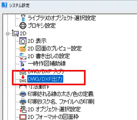 - 「システム設定」ウィンドウの左側にあるツリー項目から「DWG/DXF出力」をクリックで選択します。