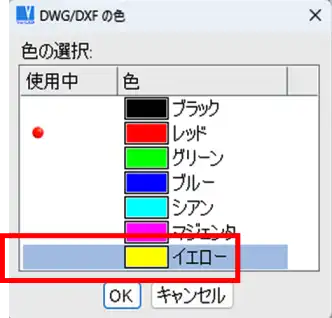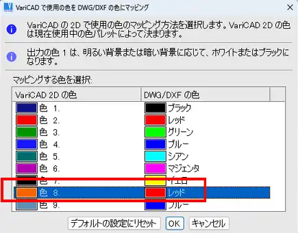 - 割り当てる色を変更したい線分の色を「VariCAD 2D の色」欄からクリックで選択します。
