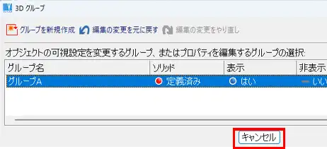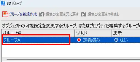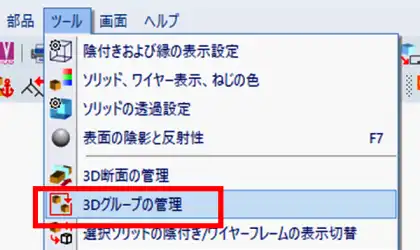 - メニューバーの「ツール」>「3Dグループの管理」をクリックで選択します。