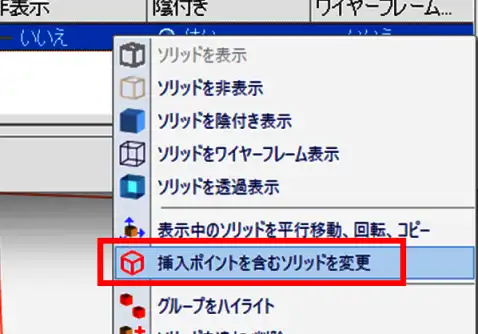 - 表示されるオプションから「挿入ポイントを含むソリッドを変更」をクリックで選択します。