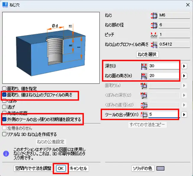 - 「外側のツールの出っ張りの初期値を設定する」と「面取り、値はねじ山のプロファイルの高さ」にチェックを入れ、「深さ」、「ねじ面の高さ」、「ツールの出っ張り」入力欄に値を入力し、「OK」をクリックします。