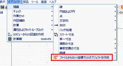- メニューバーの「オブジェクト」>「描画」>「ファイルからのXY座標で2Dオブジェクトを作成」をクリックで選択します。