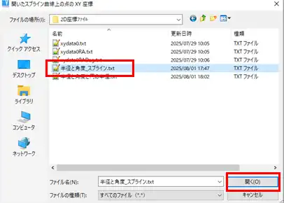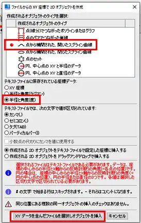 - 「ファイルからのXY座標で2Dオブジェクトを作成」ウィンドウで「点から補間された、開いたスプライン曲線」をクリックで選択し、「半径と角度(度)」にチェックを入れます。「XYデータを含んだファイルを選択しオブジェクトを挿入」をクリックします。
