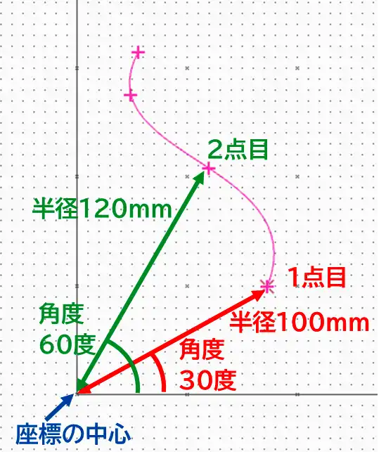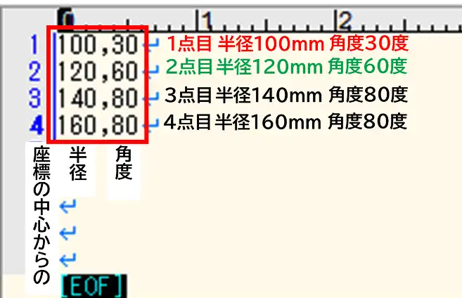下図のような座標の中心からの半径とX軸からの角度が入力されたテキストファイル(.txt)をVariCADに取り込んで、スプライン曲線を作成します。テキストファイルから円を作成したい場合は、半径と角度が入力されたtxtファイルから円を作成したい をご覧ください。