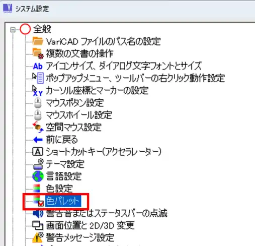 - 「システム設定」ウィンドウの左側ツリー項目から「色パレット」をクリックで選択します。