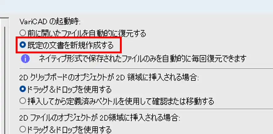 VariCAD 起動時に前回作業していたファイルが自動で開くのを止める設定方法を説明します。デフォルトでは、起動時に前回作業していたファイルが自動で開く設定になっています。