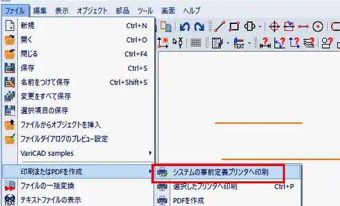 - メニューバーの「ファイル」>「印刷またはPDFを作成」>「システムの事前定義プリンタへ印刷」をクリックで選択します。