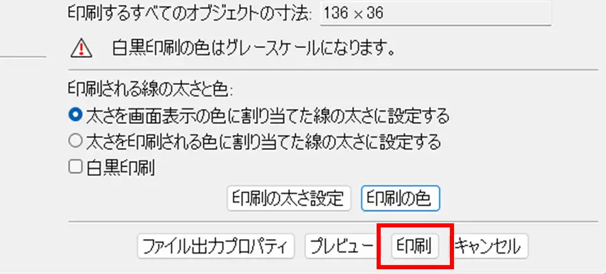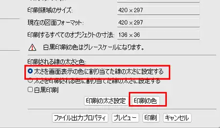 - 「印刷」ウィンドウで、「太さを画面表示の色に割り当てた線の太さに設定する」オプションにチェックを入れ、「印刷の色」をクリックします。