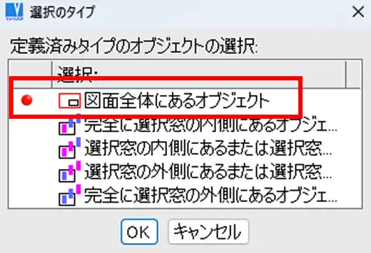 - 「図面全体にあるオブジェクト」をクリックで選択します。