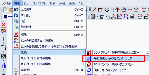 - メニューバーの「編集」>「変換」>「平行移動、カーソルによるドラッグ」をクリックで選択します。