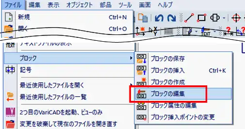- 再度、メニューバーの「ファイル」>「ブロック」>「ブロックの編集」をクリックで選択します。