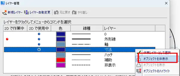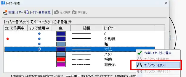 ※寸法を再表示する場合は、上記手順の手順2同様に「レイヤー」コマンドを呼び出し、「レイヤーの管理」ウィンドウのレイヤーの一覧から「寸法」の行をクリックし、表示されるオプションから「オブジェクトを表示」をクリックで選択します。