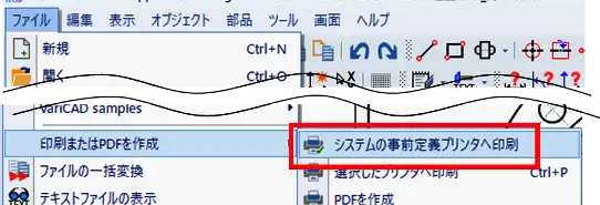 - 次に印刷を行います。メニューバーの「ファイル」>「印刷またはPDFを作成」>「システムの事前定義プリンタへ印刷」をクリックで選択します。