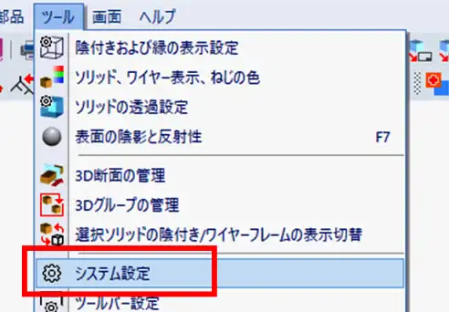 - メニューバーの「ツール」>「システム設定」をクリックで選択します。
