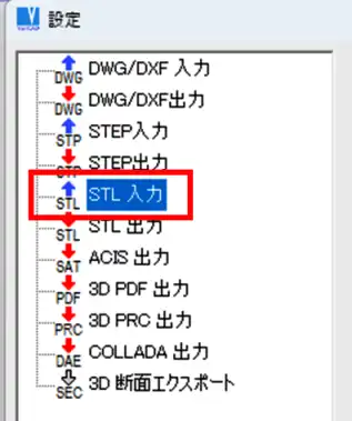 - 「設定」ウィンドウの左側ツリー項目で「STL入力」をクリックします。