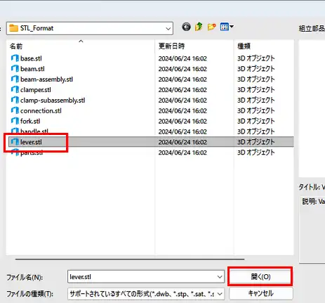 - 「開く」ウィンドウに戻り、開きたいSTLファイルをクリックで選択します。「開く」をクリックします。