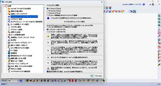 - VariCADを再起動し、確認すると、下図のように設定ウィンドウが画面上に収まって表示されます。