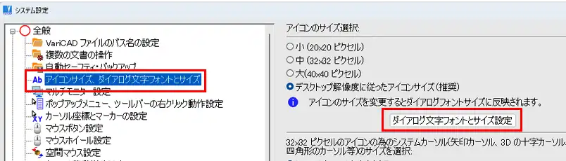 - 「システム設定」ウィンドウのウィンドウ左側ツリー項目で「アイコンサイズ、ダイアログ文字フォントとサイズ」をクリックで選択し、ウィンドウ右側に表示される「ダイアログ文字フォントとサイズ設定」をクリックします。