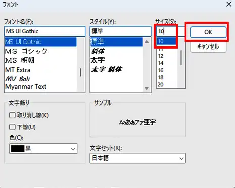 - 「フォント」ウィンドウのフォントの「サイズ」欄で10をクリックで選択するか手入力します。「OK」をクリックします。