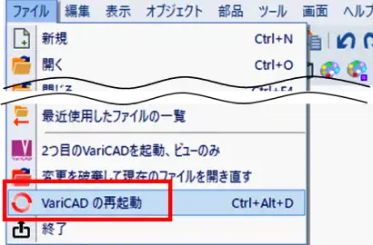 - メニューバーの「ファイル」>「VariCADの再起動」をクリックで選択します。