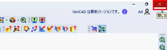 - VariCADがテストモードで再起動します。画面右上の×(閉じる)ボタンをクリックします。