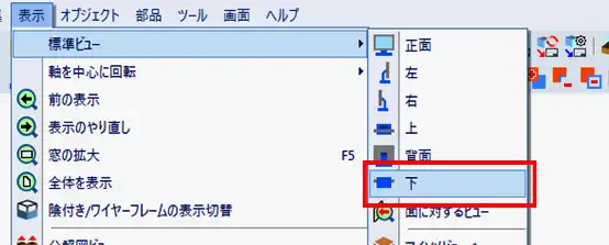 - まず、ビューを下から見たビューに切り替えます。メニューバーの「表示」>「標準ビュー」>「下」をクリックで選択します。