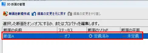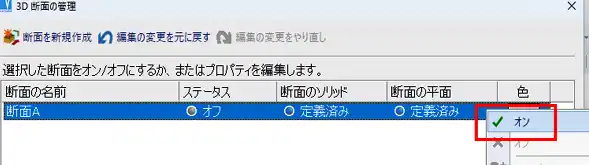 - 「3D断面の管理」ウィンドウに戻り、作成した断面をクリックで選択し、「オン」をクリックします。
