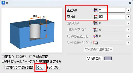 - 「穴」ウィンドウで、「直径」 欄に20、「深さ」欄に50を入力します。「OK」をクリックします。