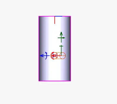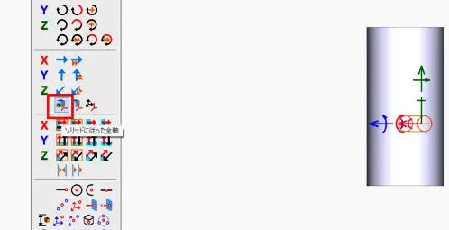 - 穴の挿入軸の向きが変わります。次に穴を円筒ソリッドに対し横に配置します。穴ソリッドのXYZ挿入軸のZ軸(緑色)の外側回転矢印をクリックします。