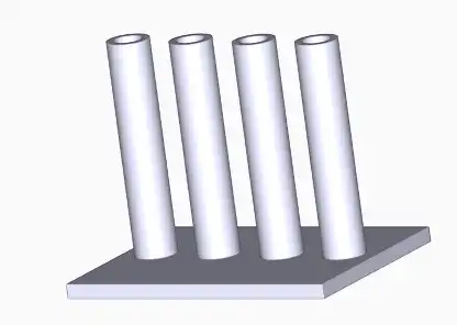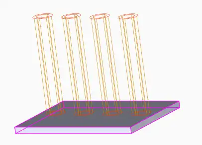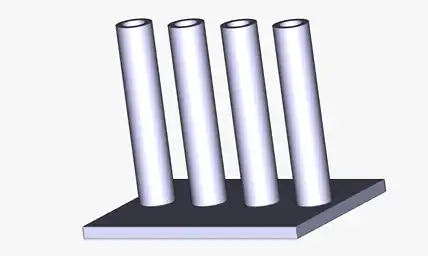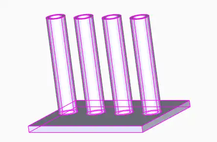 複数のソリッドを選択して一括で交差計算なしでソリッドへ追加(結合)する方法を紹介します。ここでは、4本のパイプソリッドを選択して、下部の長方形ソリッドに交差計算なしで一括で追加します。