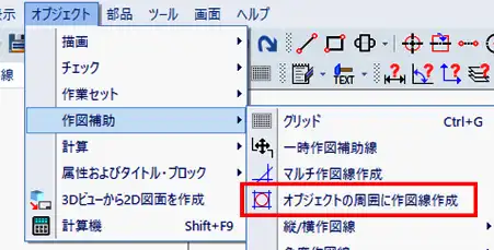 - メニューバーの「オブジェクト」>「作図補助」>「オブジェクトの周囲に作図線作成」をクリックで選択します。