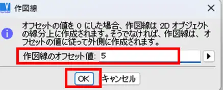 - 「作図線」ウィンドウで「作図線のオフセット値」欄に5を入力し、「OK」をクリックします。