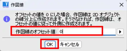 - 上記手順3の「作図線」ウィンドウで「作図線のオフセット値」欄に0と入力し、「OK」をクリックします。