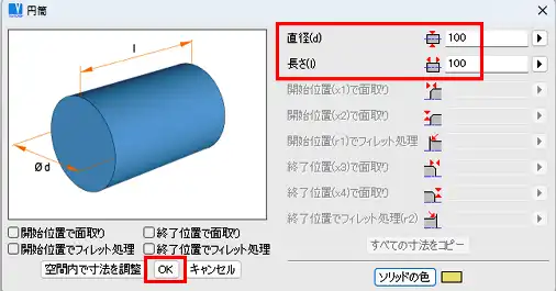 - 「円筒」ウィンドウで、「直径」「長さ」欄に値を入力し、「OK」を左クリックします。