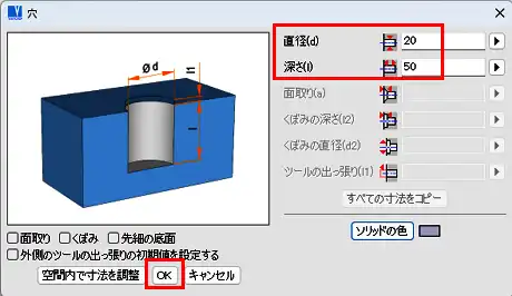 - 「穴」ウィンドウで、「直径」、「深さ」入力欄に値を入力します。「OK」を左クリックします。