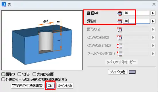- 「穴」ウィンドウの「直径」、「深さ」入力欄に値を入力し、「OK」をクリックします。