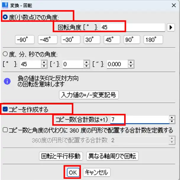 - 「変換」ウィンドウで、「コピーを作成する」オプションにチェックを入れ、「コピー数」欄に穴のコピー数を入力します。「度(小数点)での角度」にチェックを入れ、「回転角度」欄に値を入力します。この例では、45度ずつずらして穴を配置するので「45」と入力します。「OK」をクリックします。
