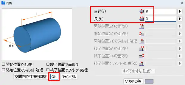 - 「円筒」ウィンドウが表示されますので、「直径」欄に「8」、「長さ」欄に「3」と入力し、「OK」をクリックします。