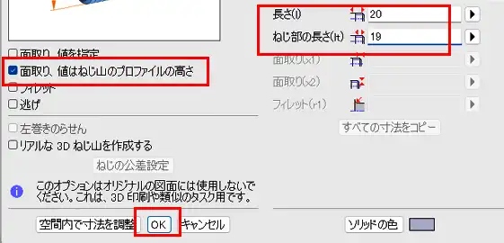 「面取り、値はねじ山のプロファイルの高さ」にチェックを入れ、「OK」ボタンをクリックします。※この例では「ねじ部の長さ」欄に「19」と入力します。