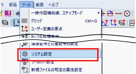 - メニューバーで「ツール」>「システム設定」を左クリックで選択します。