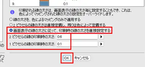- 「印刷される線の太さ/色の定義」ウィンドウで、「画面表示の線の太さに従って、印刷時の線の太さを直接設定する」オプションにチェックを入れ、太線の設定の「2 ピクセルの線の印刷時の太さ」の入力欄と細線の設定の「1 ピクセルの線の印刷時の太さ」の入力欄にそれぞれ値を入れ、「OK」を左クリックします。これで設定が完了しました。