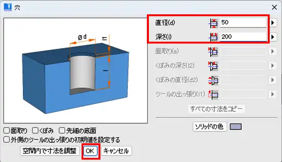 - 「穴」ウィンドウで、「直径(d)」入力欄、「深さ(l)」入力欄に任意の値を入力します。「OK」をクリックします。