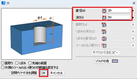 - 「穴」ウィンドウで、「直径」、「深さ」入力欄に任意の値を入力し、「OK」をクリックします。