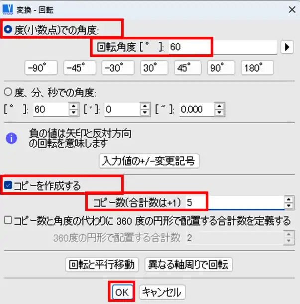 - 「変換」ウィンドウの「コピーを作成する」オプションにチェックを入れ、「コピー数」入力欄と「回転角度」入力欄に任意の値を入力します。「コピー数」入力欄には作成したい穴の数 - 1 で算出した値を入力します。「度(小数点)での角度」にチェックを入れ、回転角度入力欄には 360 ÷ 作成したい穴の数 で算出した値を入力します。「OK」をクリックします。