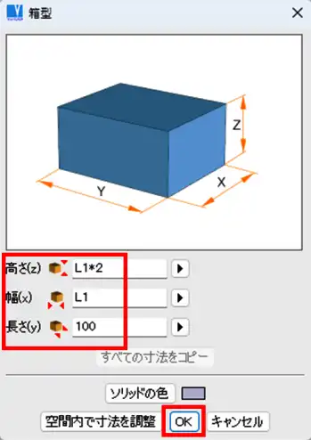- 「箱型」ウィンドウで、「高さ」入力欄に手順 3 で設定したパラメータ名 * 2 と入力します。「幅」入力欄には手順 3 で設定したパラメータ名を入力します。「長さ」入力欄に任意の値を入力し、「OK」を左クリックします。